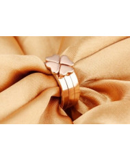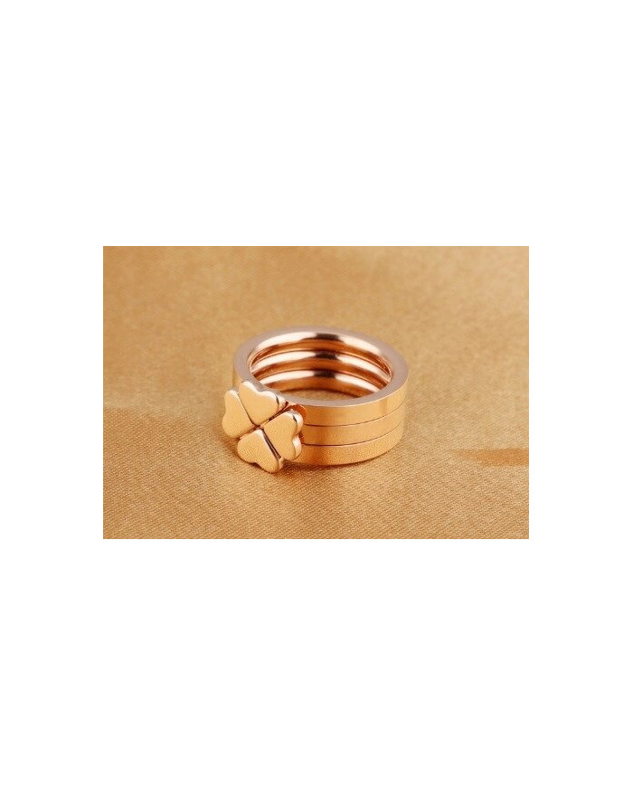 Это превосходное кольцо с четырьмя листьями клевера состоит из двух колец с милыми маленькими сердечками и третьем кольцом, представленного двумя симметричными сердечками. Их можно носить как три разных кольца или вместе по вашему желанию. Вместе эти три кольца образуют одно кольцо и демонстрируют красивый клевер. Эта модель кольца сделана из нержавеющей стали с трехслойным золотым напылением что делает ее абсолютно стойкой, и будет долго украшать вашу руку.