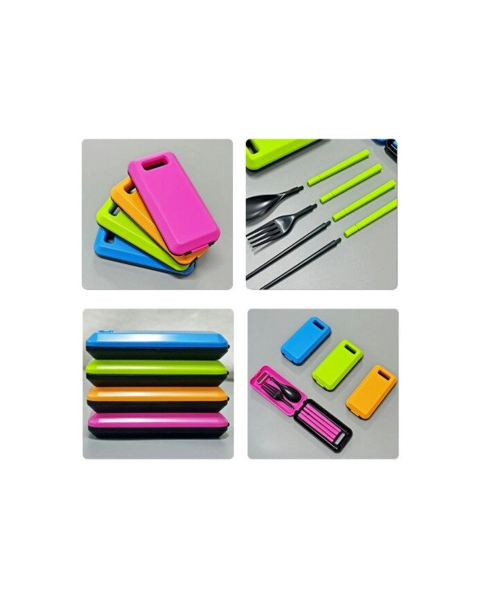 Портативный набор для обедов состоит из ложки, вилки и палочек. Изготовлены из качественного пластика. Приборы хранятся в специальном футляре с лотком и выдвижной крышкой, его поверхность гладкая, а материал легкий и прочный.